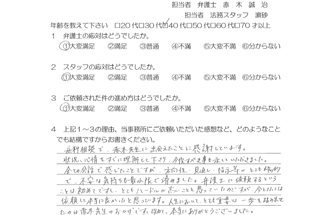 お客様の声(ご依頼者の声)評判・口コミ 公開日:2026/01/22 お客様の声 ■年代 40代 ■担当弁護士 赤木誠治 ■弁護士の応対 大変満足 ■スタッフの応対 大変満足 ■案件の進め方 大変満足 ご依頼者様 無料相談で赤木先生に出会えたことに感謝しています。状況・心情をすぐに理解して下さり、今後すべき事も示していただきました。全ての会話で感じたことですが、方向性・見通し・指示等がとても端的で、不安な気持ちも最小限で済みました。弁護士に依頼するということは初めてですし、とてもハードルの高いことと思っていたのですが、今となっては依頼して本当に良かったと思っています。人生においてとても重要な一歩を踏み出せたのは赤木先生のおかげです。改めて、本当にありがとうございました。 「お客様の声(ご依頼者の声)評判・口コミ」